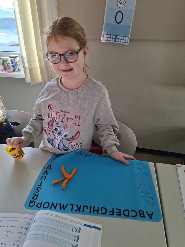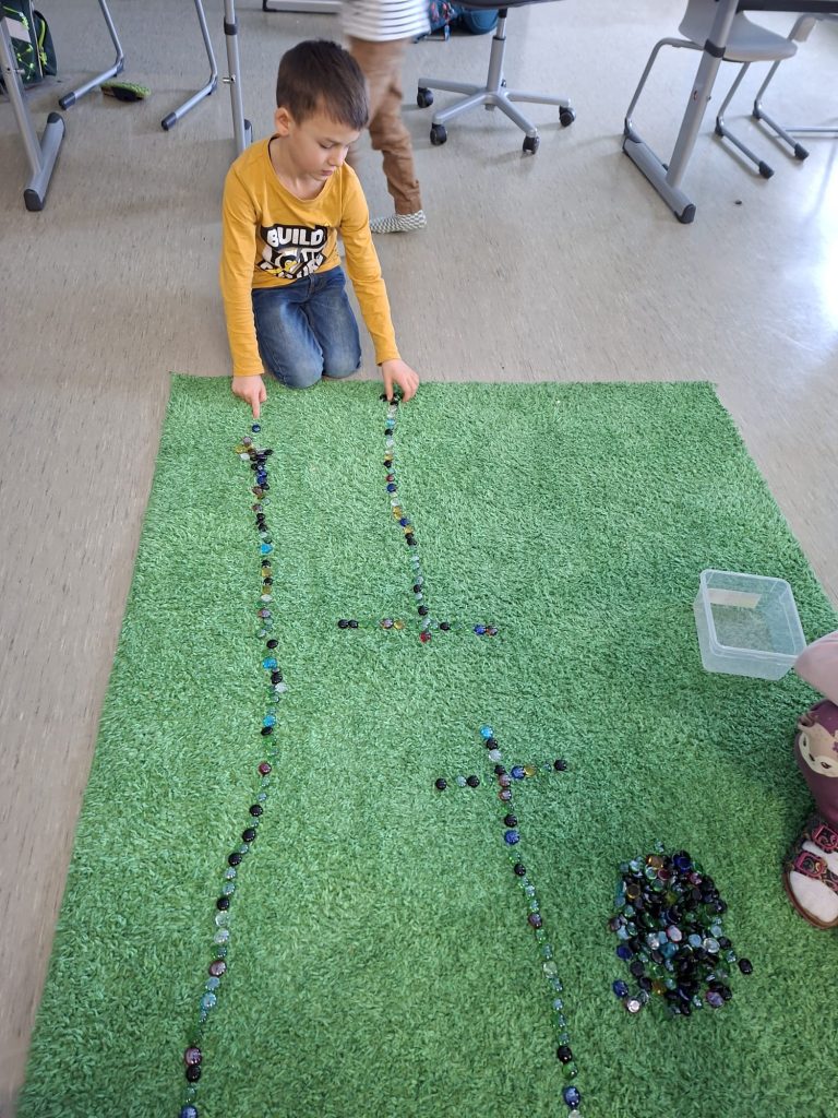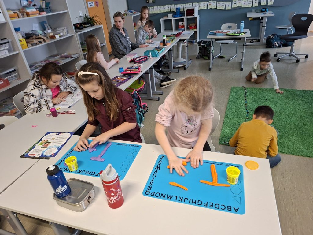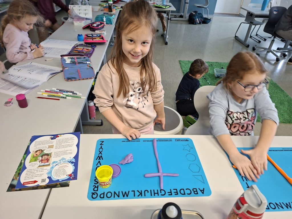 Beim Erlernen der Buchstaben wird in der 1. Stufe ganzheitlich gearbeitet. Schüler:innen legen Buchstaben mit Steinen oder formen diese aus Knetmasse.