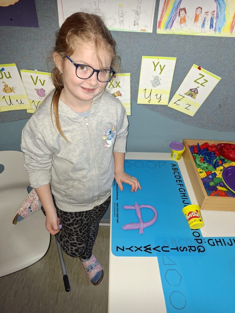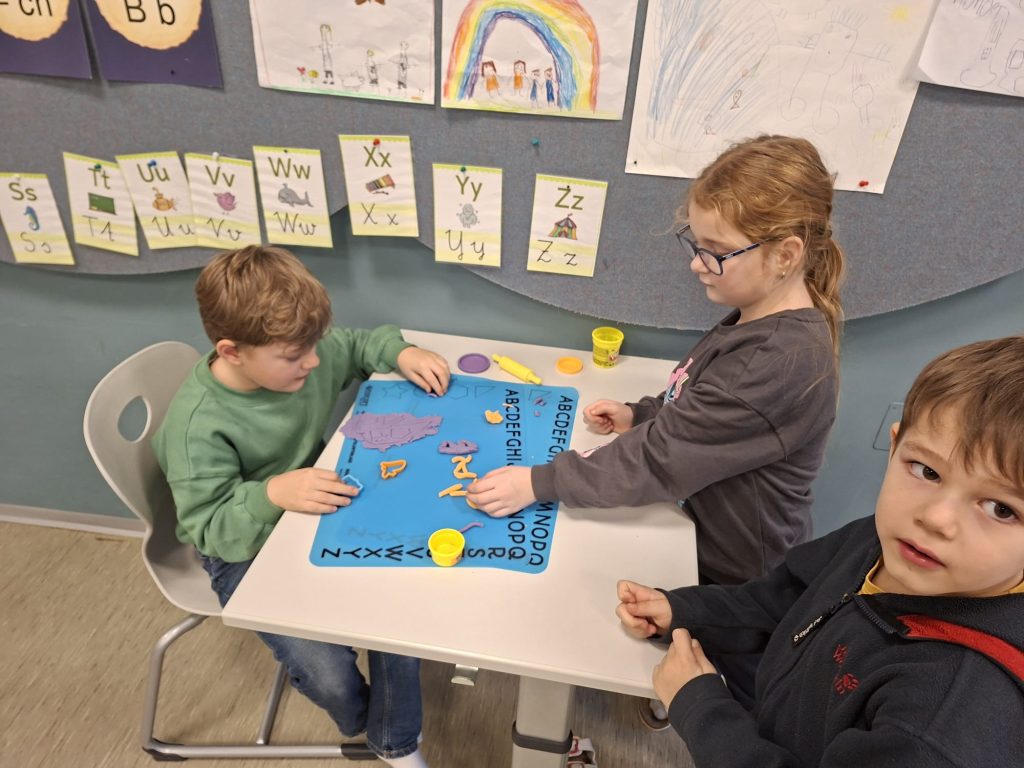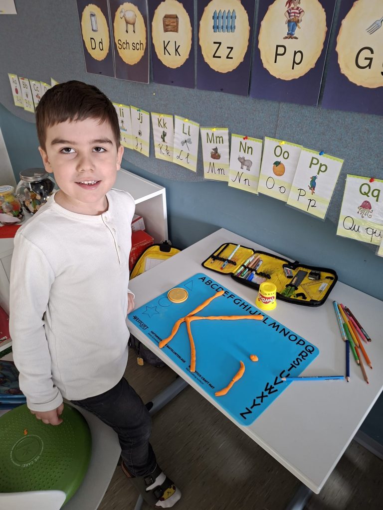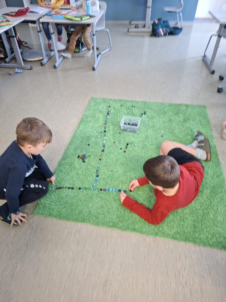 Beim Erlernen der Buchstaben wird in der 1. Stufe ganzheitlich gearbeitet. Schüler:innen legen Buchstaben mit Steinen oder formen diese aus Knetmasse.