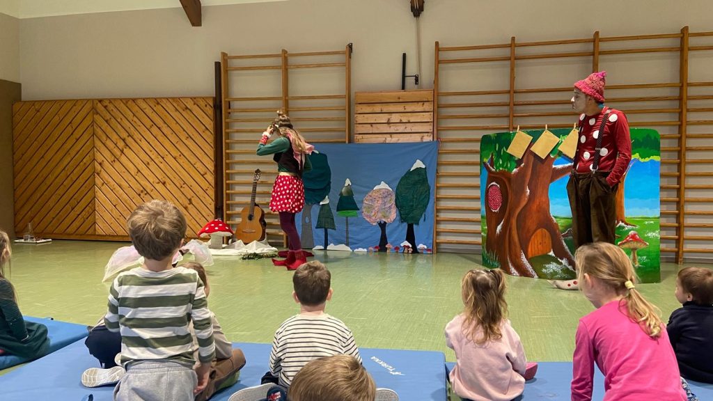 Kurz vor Weihnachten sah die 1. Klasse das Theaterstück „Die Suche nach der goldenen Nuss“. Ein kleiner Elf macht sich darin auf die Reise, um eine besondere goldene Nuss zu finden. Gemeinsam mit einem treuen Freund löst er viele lustige und spannende Rätsel. Besonders schön war, dass die Kinder immer wieder mithelfen durften und so Teil des Abenteuers wurden.