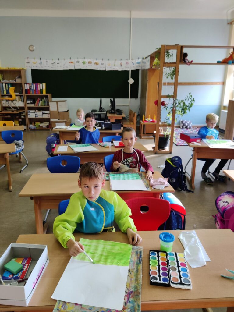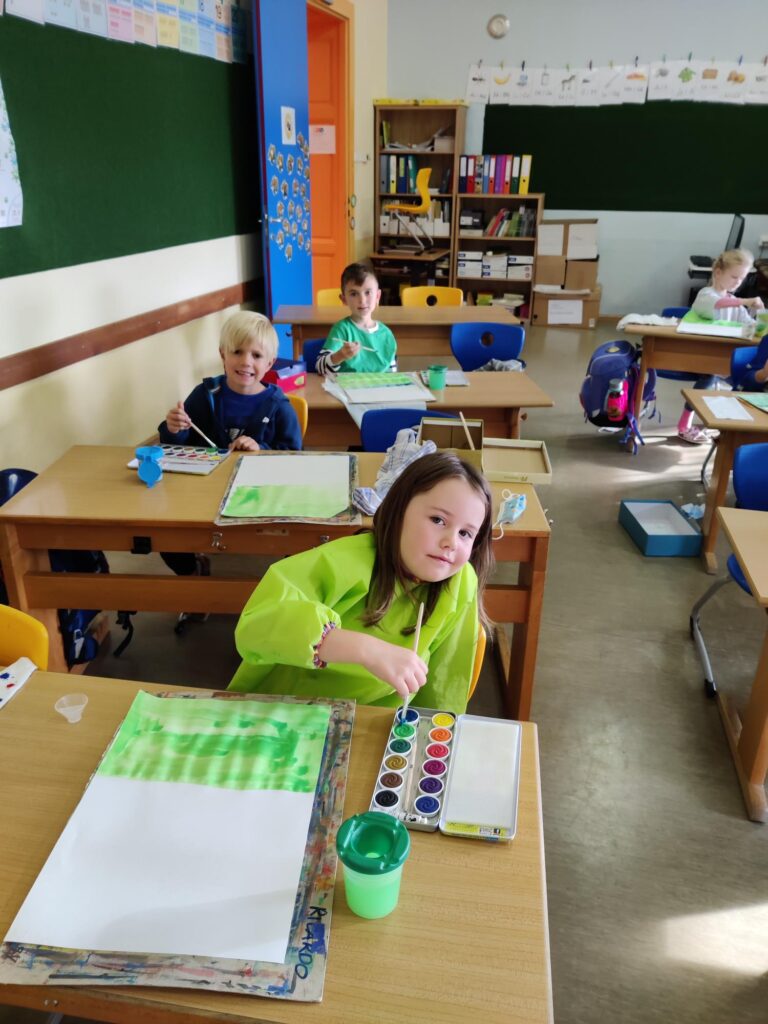 Herbstzeit ist „Schwammerlzeit“ – die Kinder der 1a gestalten einen Fliegenpilz mit Wasserfarben und Buntpapier.